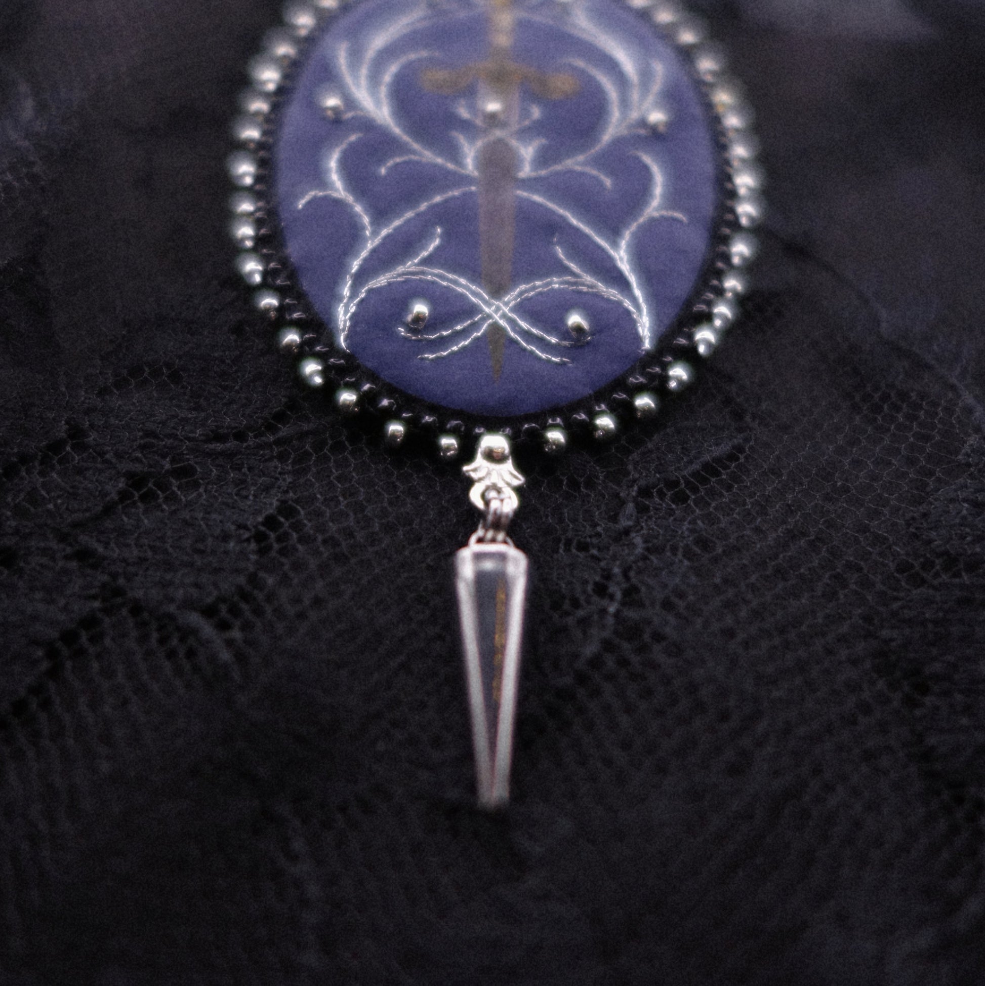 La broche est brodée de fil métallisé et de perles miyuki puis sertie de plusieurs rangs de perles miyuki agrémentés d'une breloque cone en acier inoxydable. Les apprêts sont également en acier inoxydable.