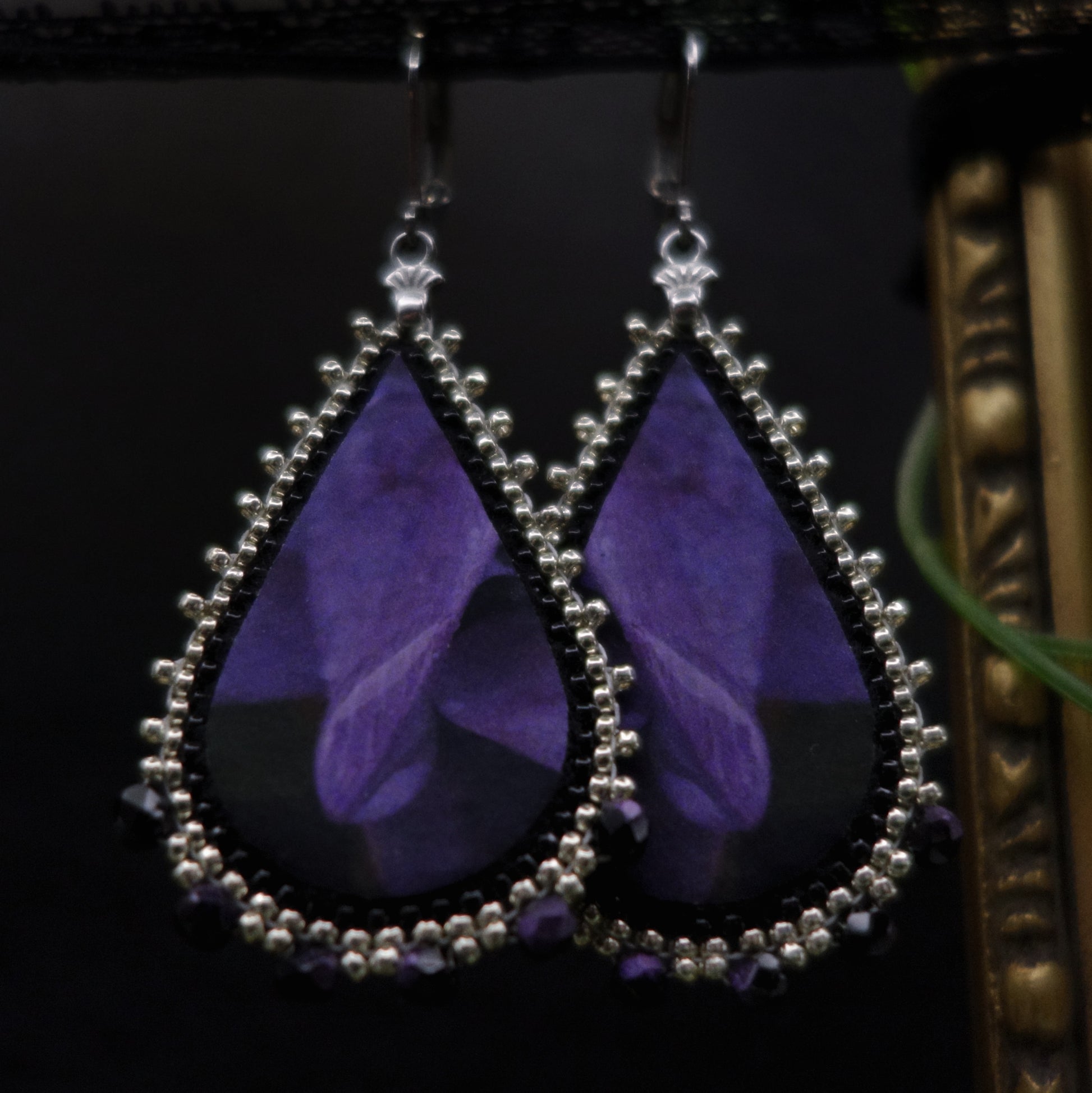 Les boucles sont serties de plusieurs rangs de perles miyuki agrémentés de perles de verre facettées violettes et noires.