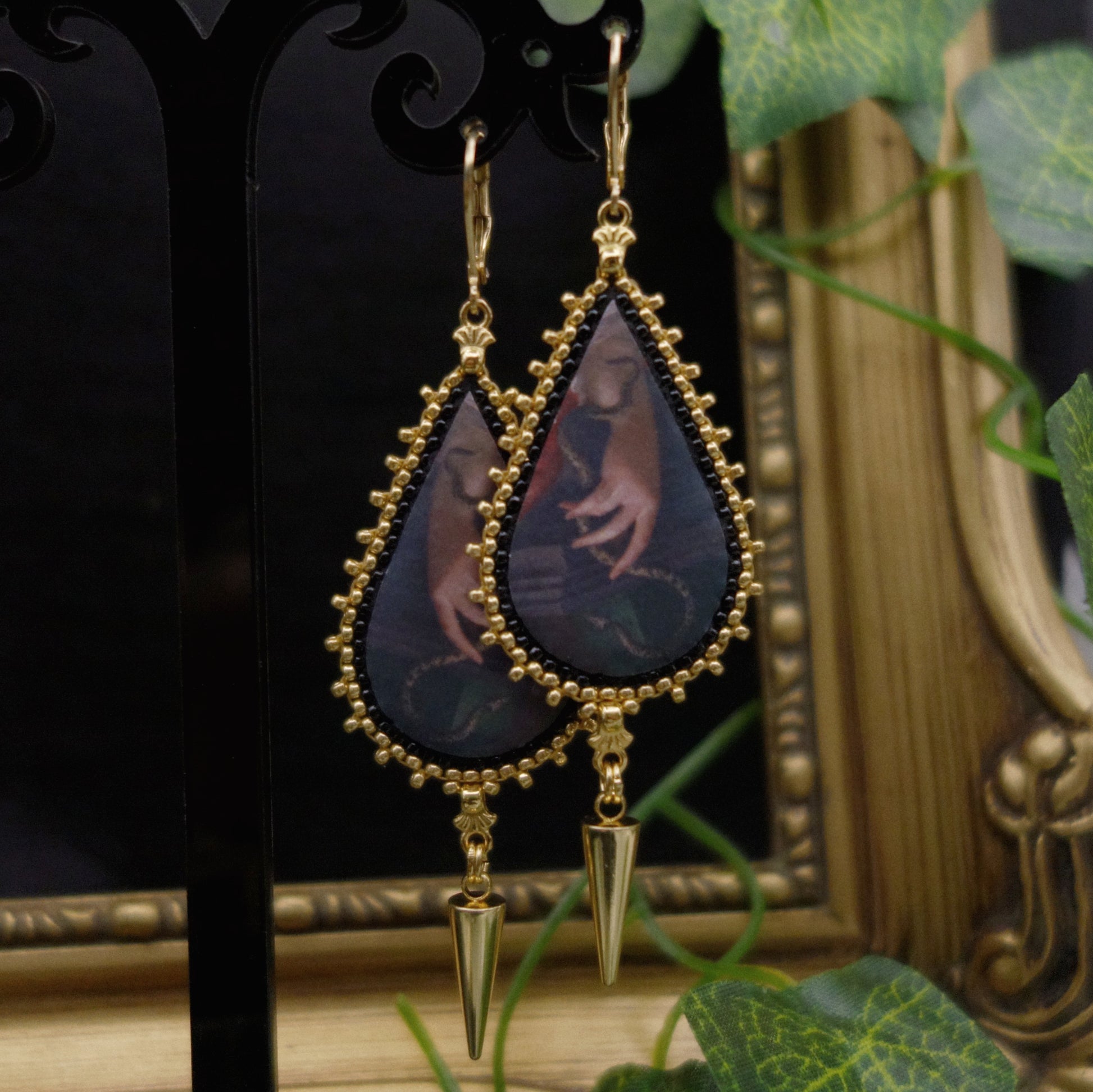 Les boucles sont serties de plusieurs rangs de perles miyuki agrémentés de breloques en acier inoxydable.