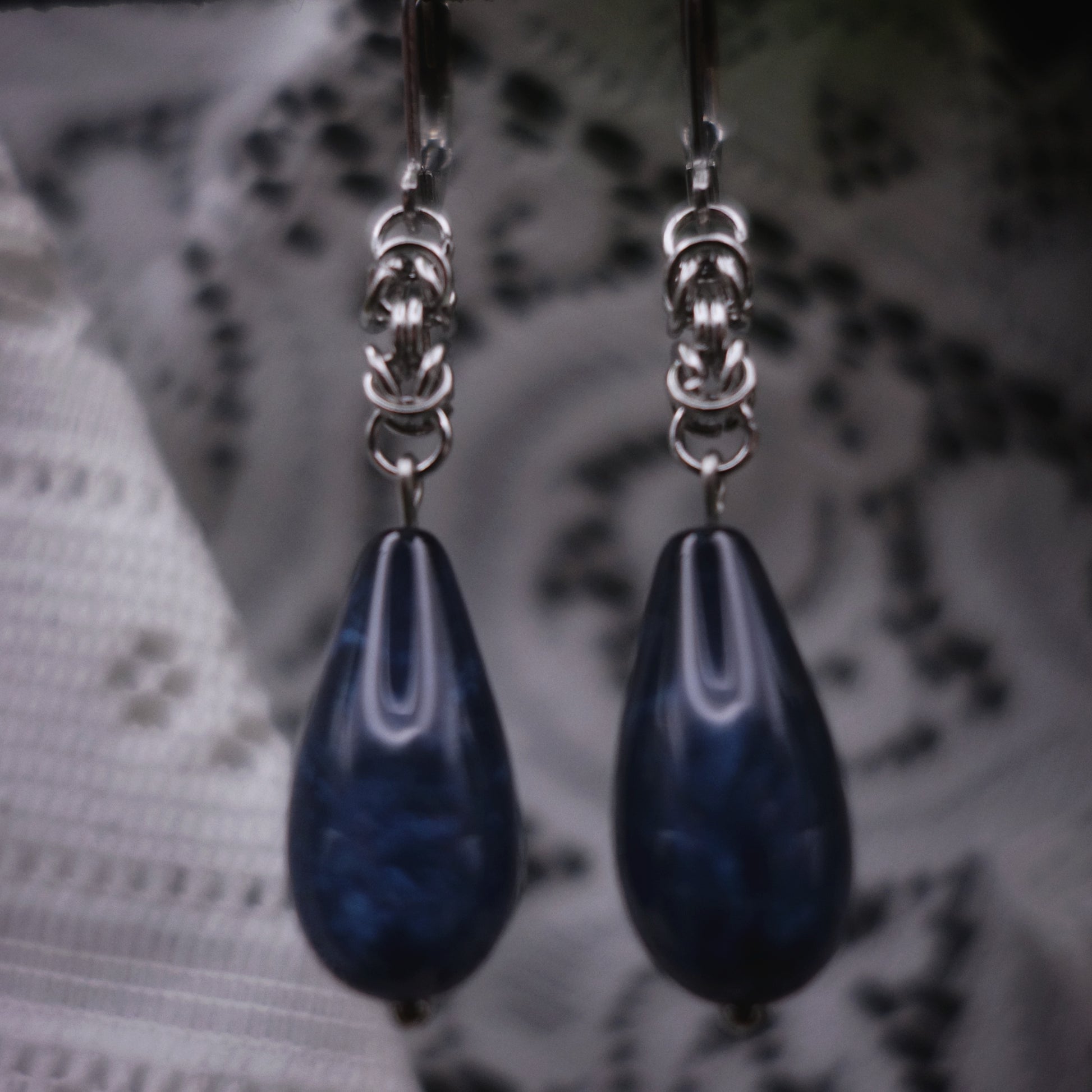 Boucles composées de tissages d'anneaux en acier inoxydable et de perles en acrylique.