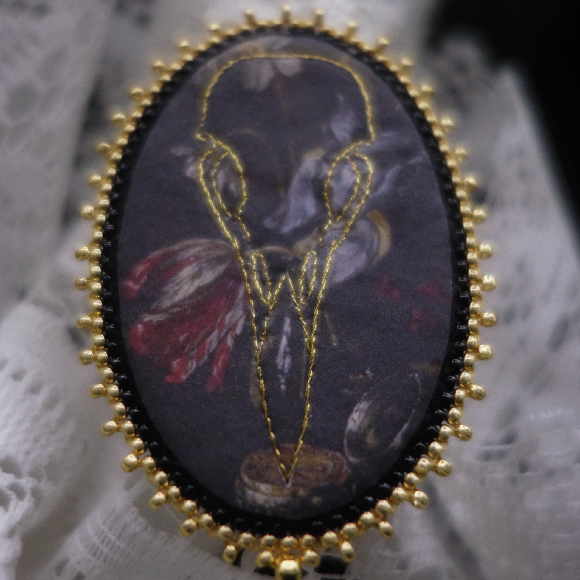 La broche est brodée de fil métallisé puis sertie de plusieurs rangs de perles miyuki agrémentés de perles de verre facettées.
