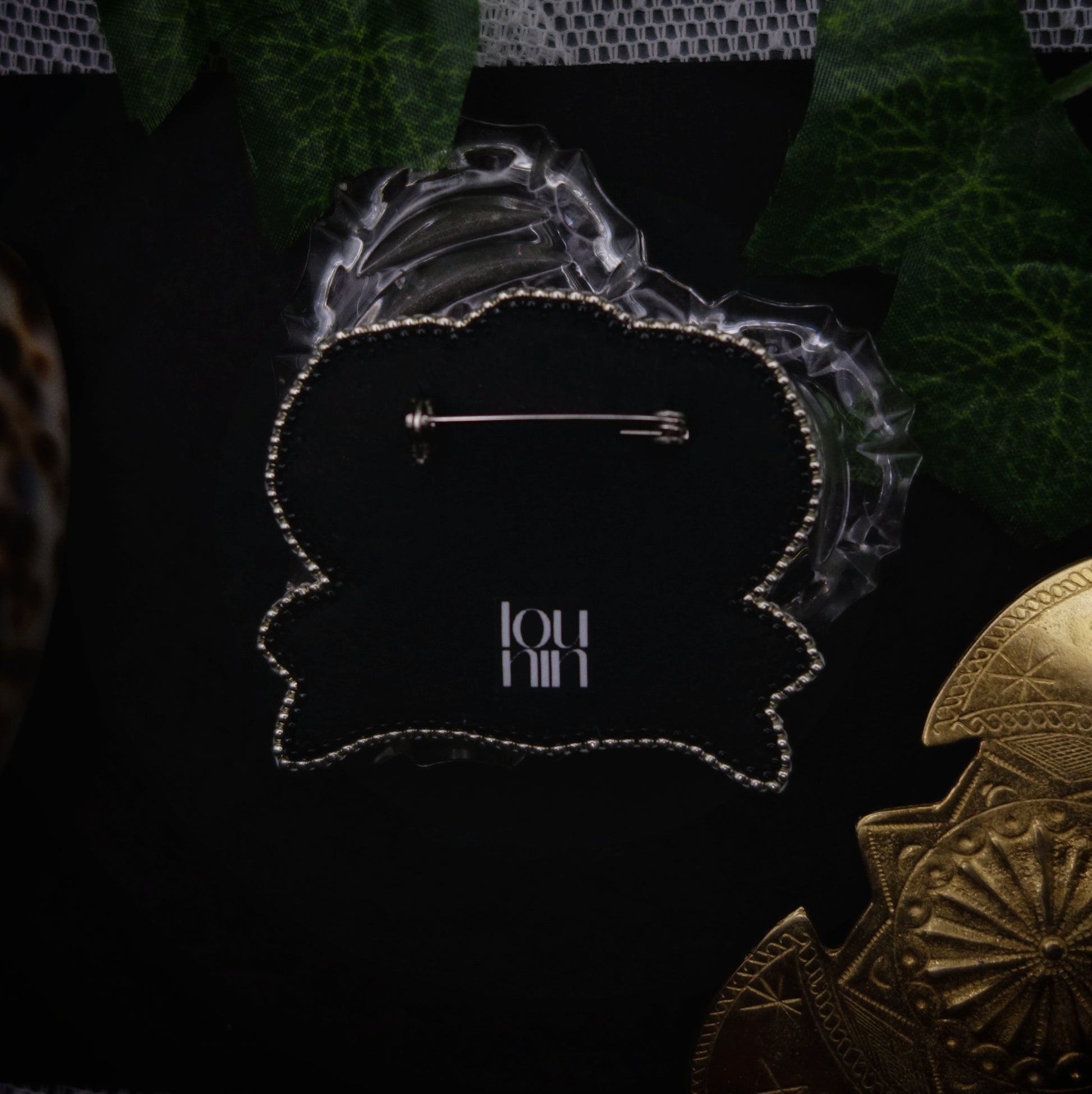 La broche est brodée de fil métallisé et de perles miyuki puis sertie de plusieurs rangs de perles miyuki.