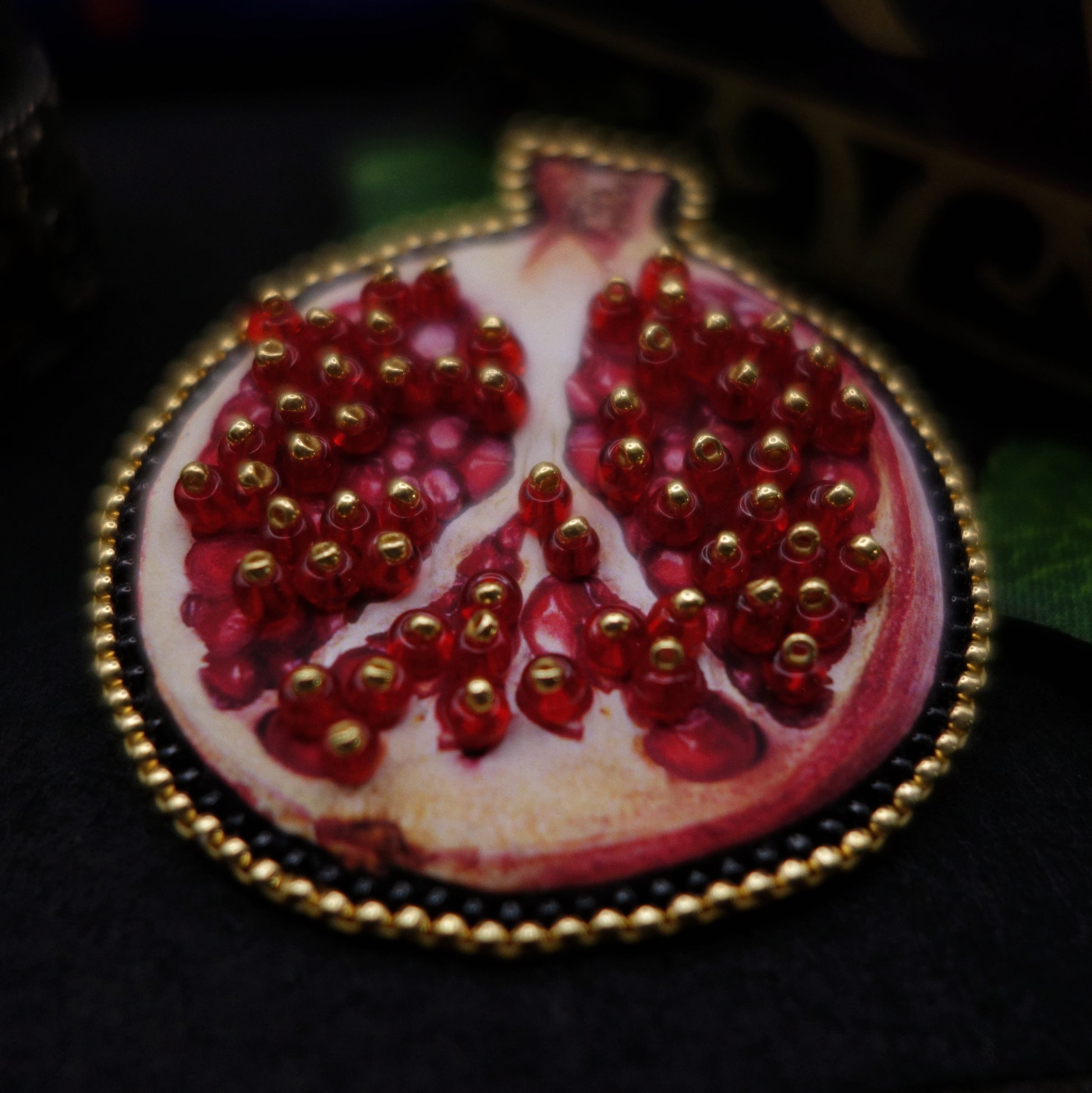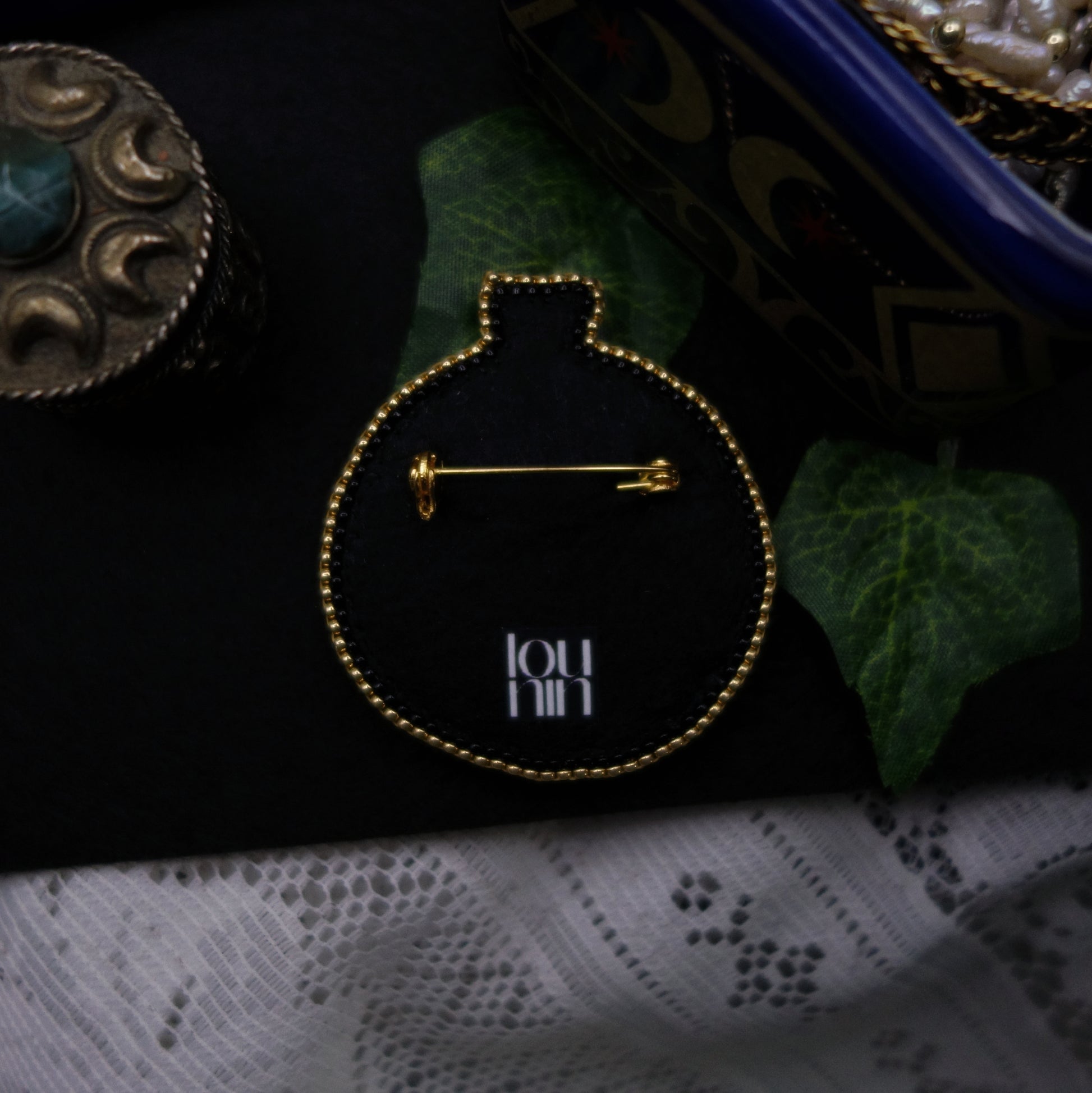 La broche est brodée de perles de verre et de perles miyuki puis sertie de plusieurs rangs de perles miyuki.