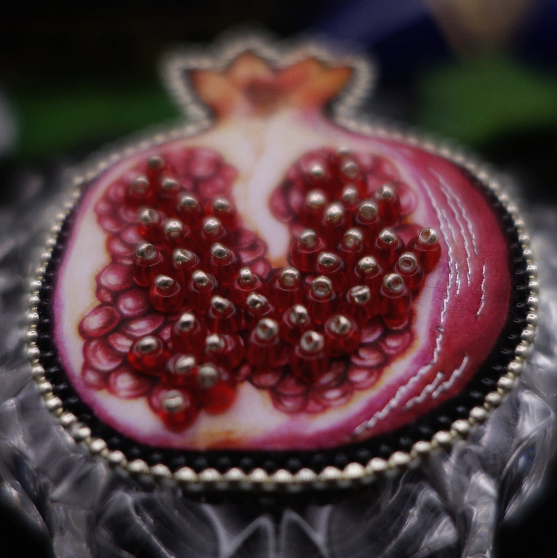 La broche est brodée de perles de verres et de perles miyuki ainsi que de fil métallisé. Elle est ensuite sertie de plusieurs rangs de perles miyuki.