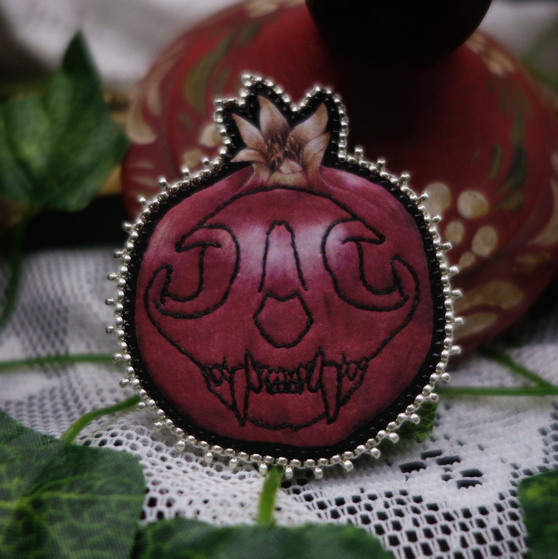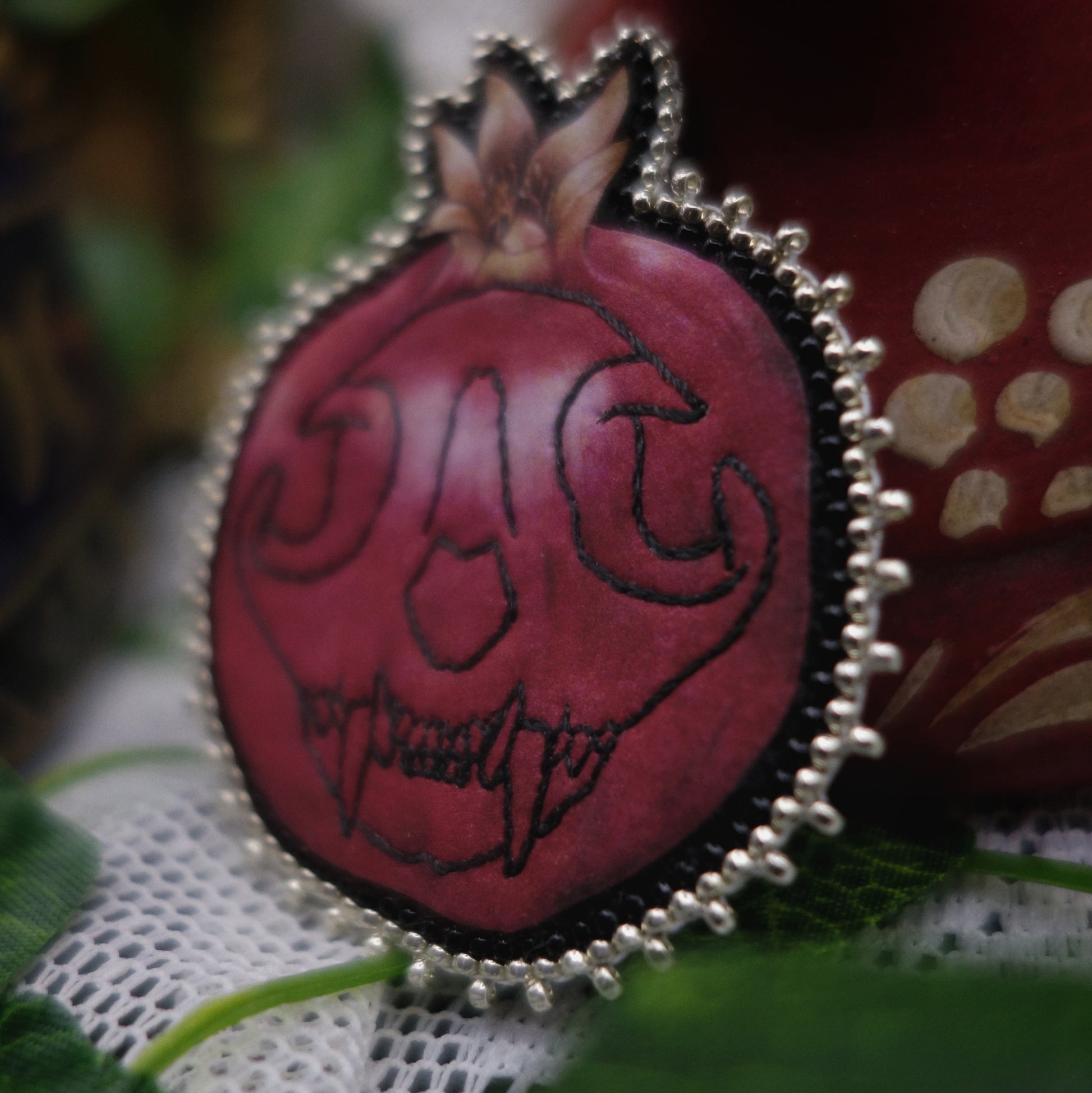 La broche est brodée de fil de polyester puis sertie de plusieurs rangs de perles miyuki.