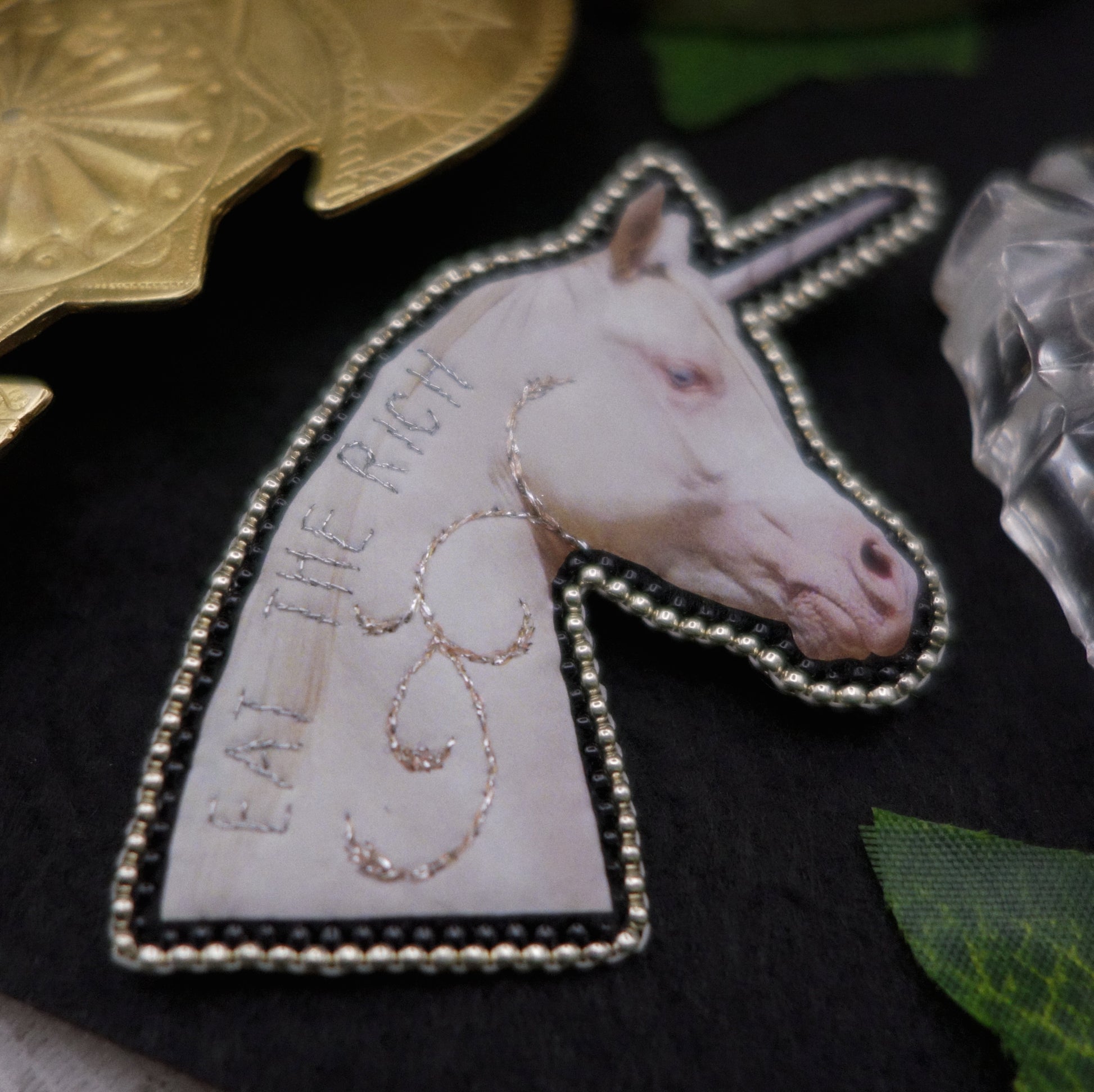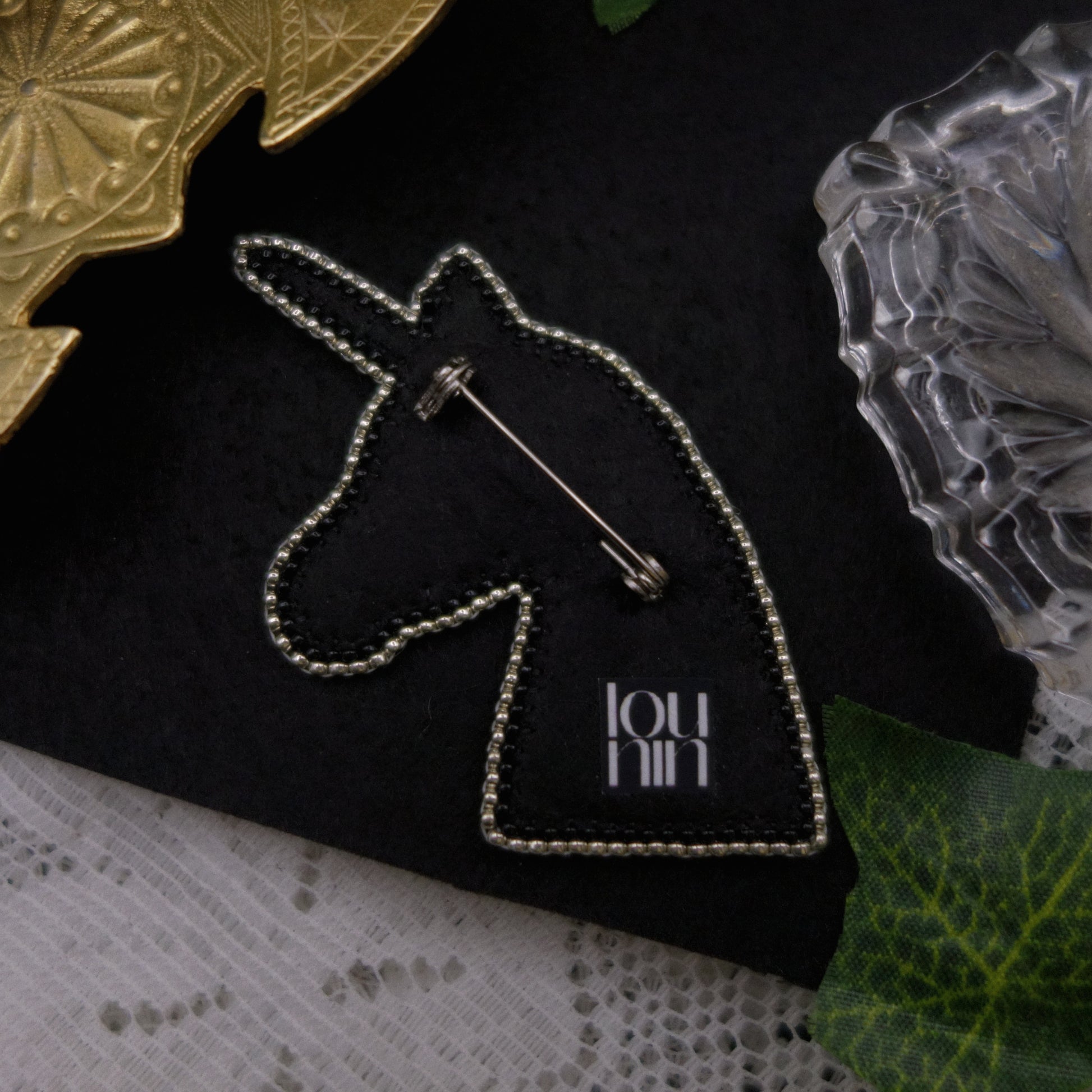 La broche est brodée de fil métallisé puis sertie de plusieurs rangs de perles miyuki.