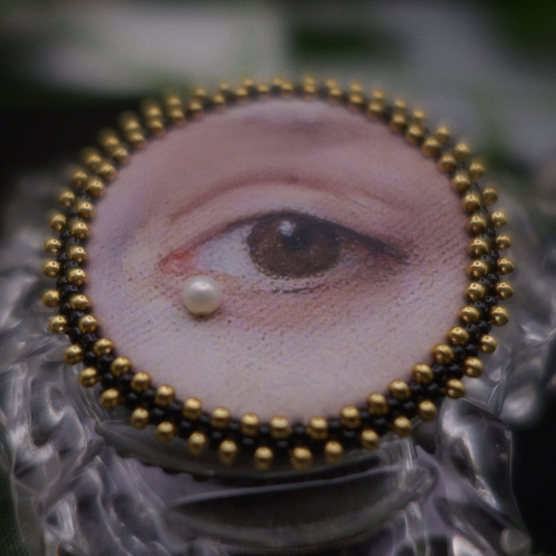 La broche est brodée d'une perle d'eau douce puis sertie de plusieurs rangs de perles miyuki tissés.