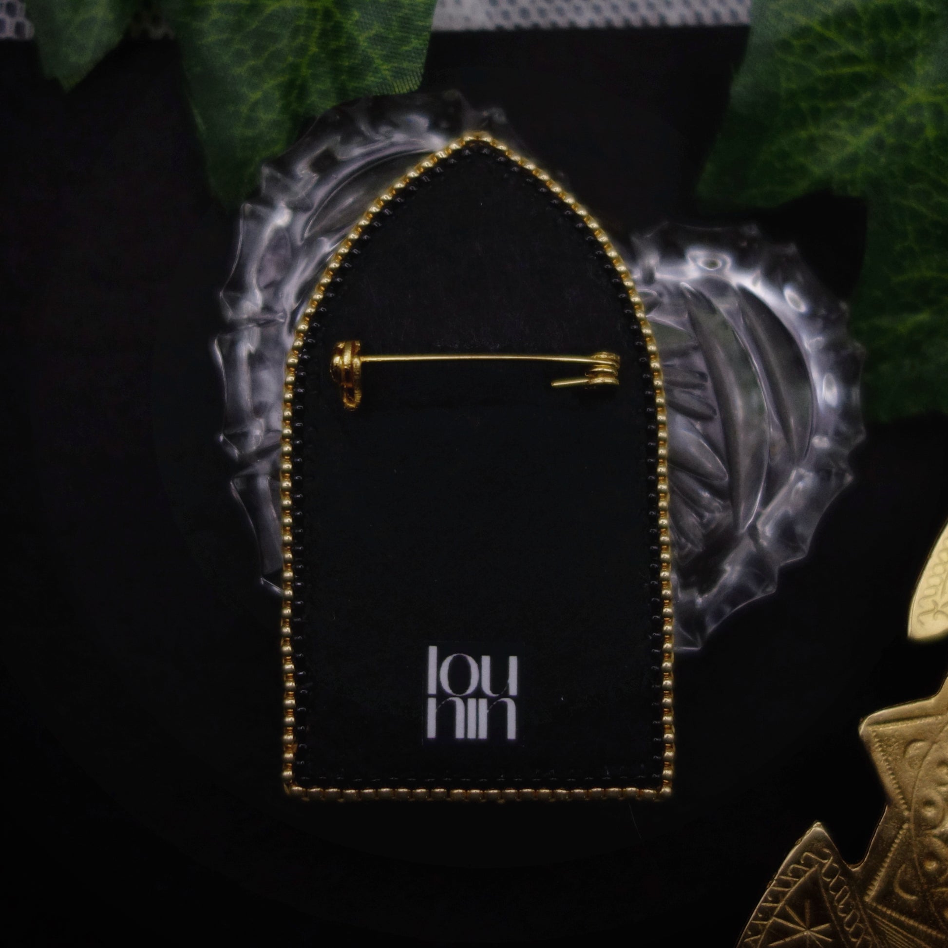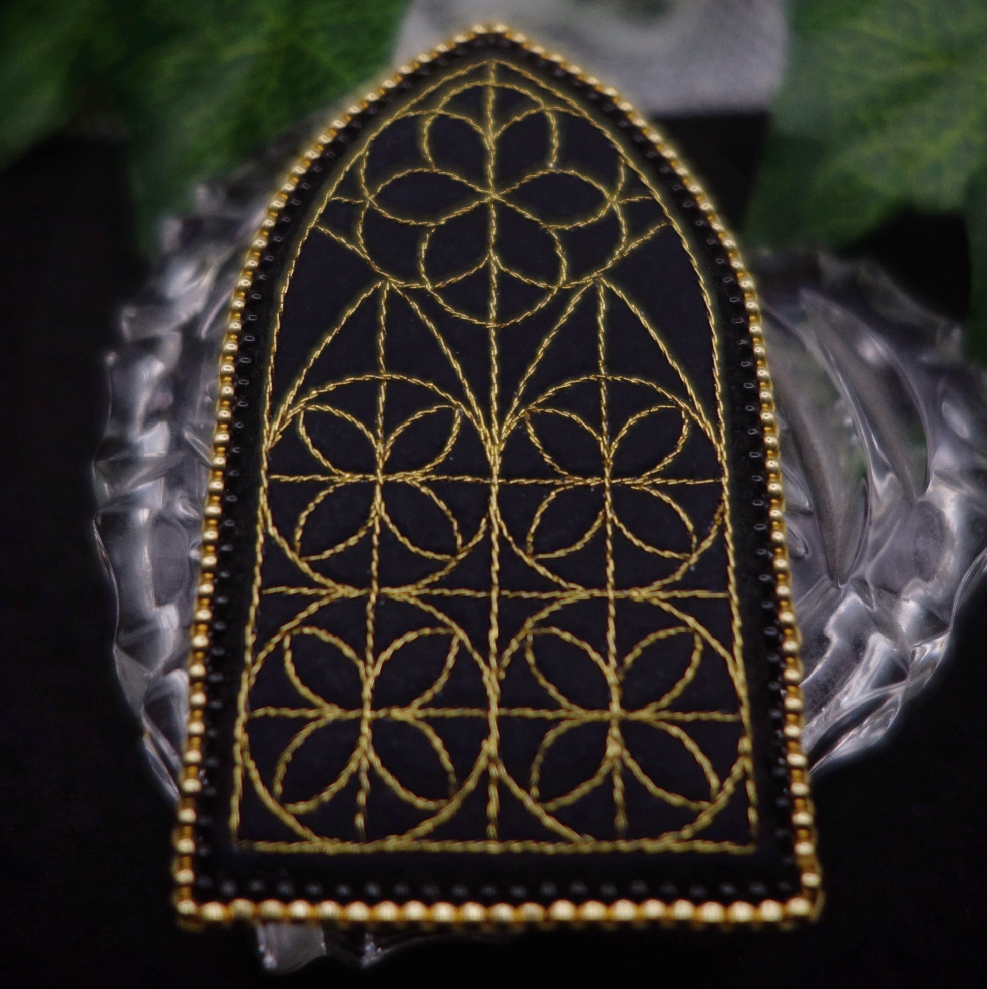 La broche est brodée de fil métallisé et sertie de plusieurs rangs de perles miyuki.