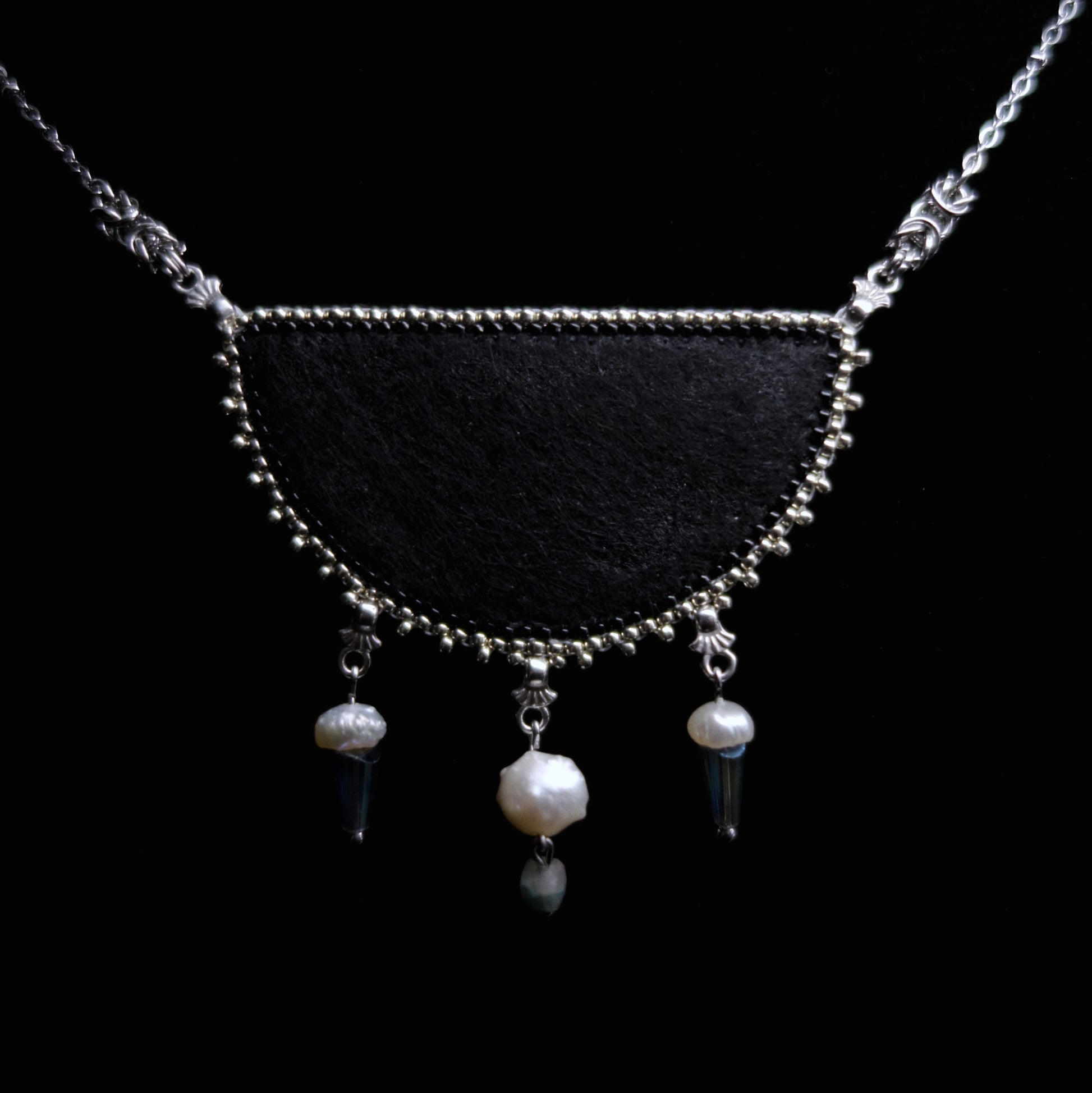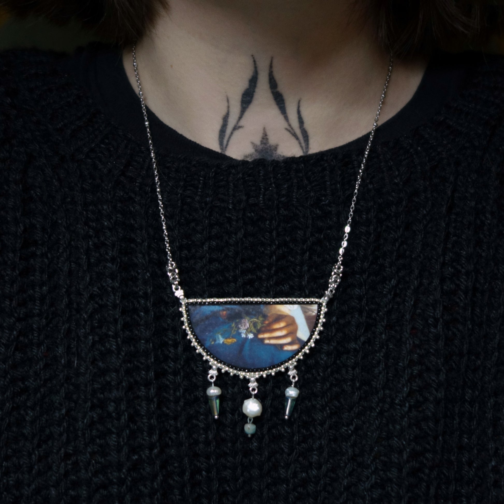 Collier composé d'un pendentif avec un extrait de tableau ancien imprimé sur du papier destiné au transfert sur textile et apposé sur feutrine, serti de plusieurs rangs de perles miyuki agrémentés de perles d'eau douce, de perles en verre et d'une perle de chrysocolle.